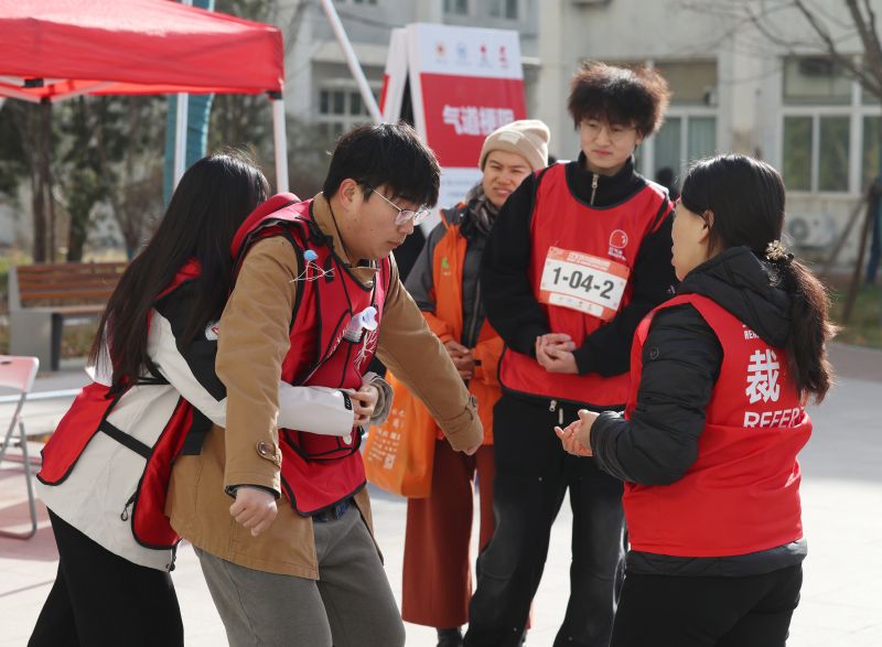 大学生完成心肺复苏术通关任务。心肺复苏+AED操作规则:每队2名选手配合,1人胸外按压、1人操作 AED,裁判判定合格即通关。