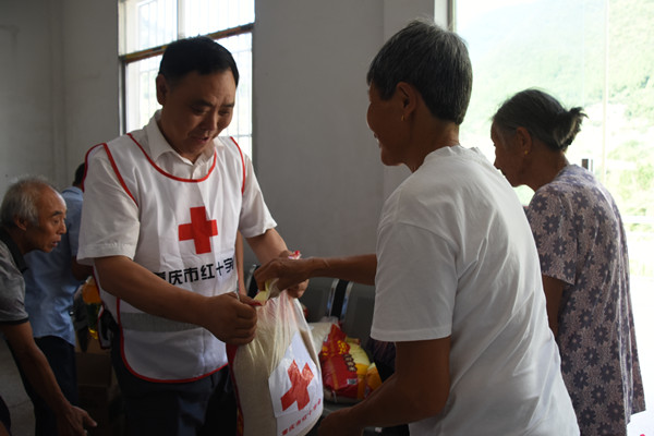 重庆市奉节县红十字会工作人员为受灾群众发放救灾物资。