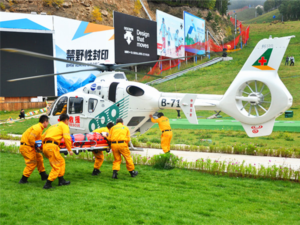 活动现场,举行了向京津冀三地红十字救护救援志愿服务队授旗仪式,应急救护救援演练随即拉开序幕。演练活动别开生面,来自张家口学院护理专业的学生志愿者现场演示心肺复苏、创伤包扎等应急救护技能,她们动作娴熟,整齐划一,表现出训练有素、扎实精湛的技术功底。模拟救援环节演练了运动员雪道受伤和外国观众意外受伤两个突发情况下的创伤救护、应急救援和直升机转运伤员等项目。当红十字救援直升机搭载模拟伤员成功起飞时,现场响起热烈的掌声。