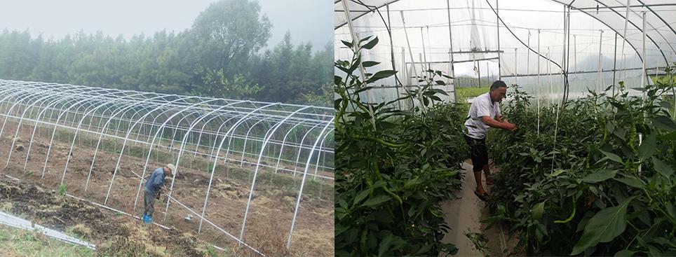 拼版照片:左为大棚蔬菜搭建前;右为大棚辣椒丰收后。