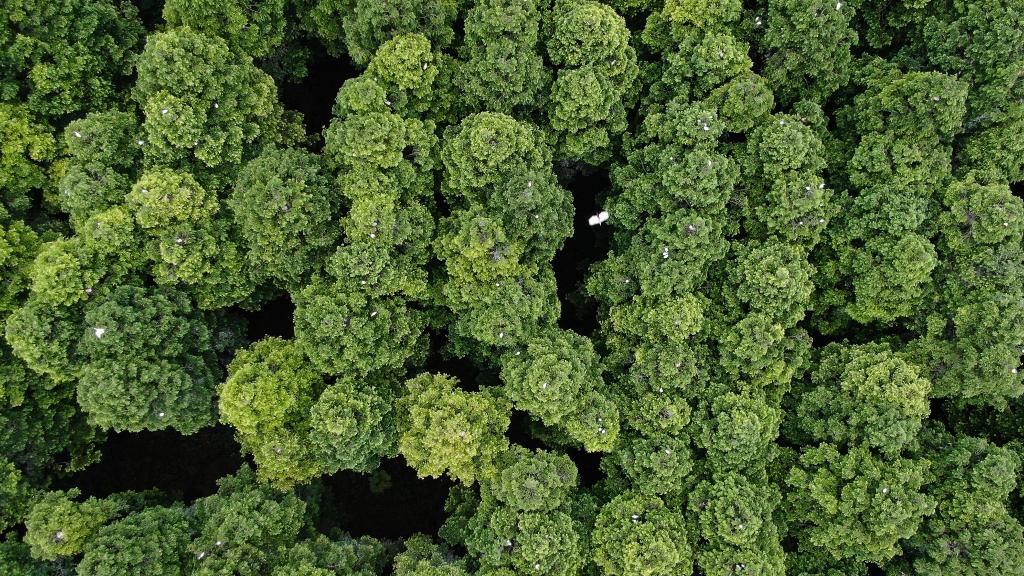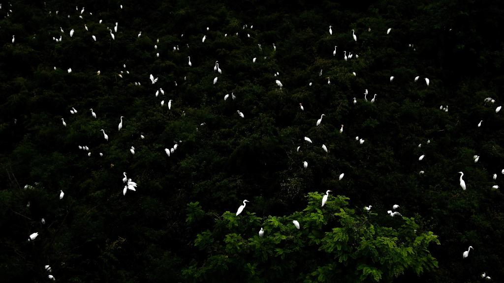 在江苏省大丰麋鹿国家级自然保护区,大量白鹭在树顶栖息。(无人机拍摄)新华社记者李响摄