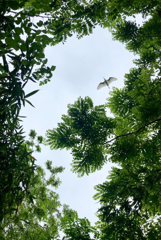 在江苏省大丰麋鹿国家级自然保护区,一只白鹭飞过树梢。新华社记者李响摄