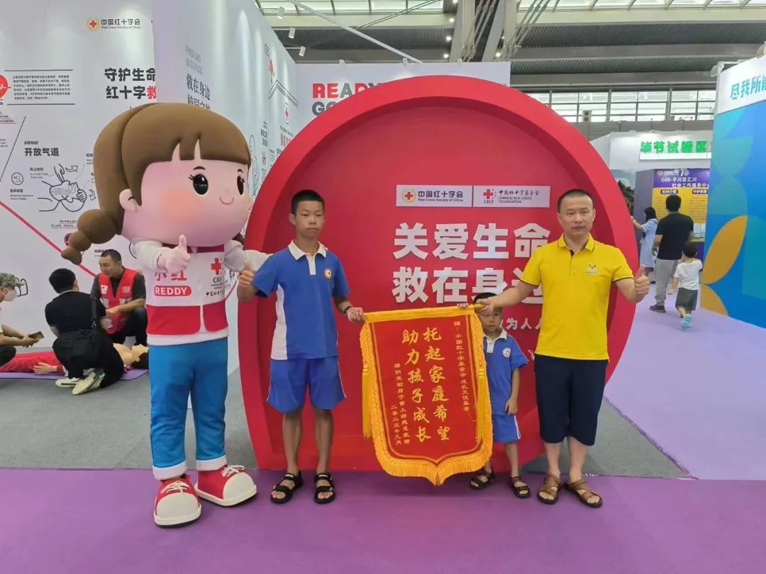 9月16日上午,在深圳举办的第十届中国慈展会上,一位父亲带着两个儿子来到中国红十字基金会的展位,郑重地送上一面锦旗。锦旗上写着:托起家庭希望,助力孩子成长。