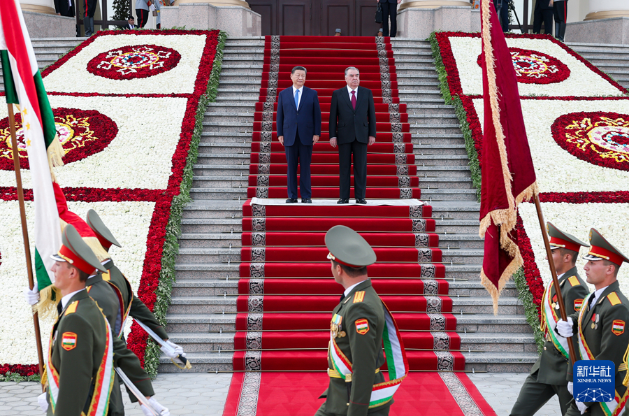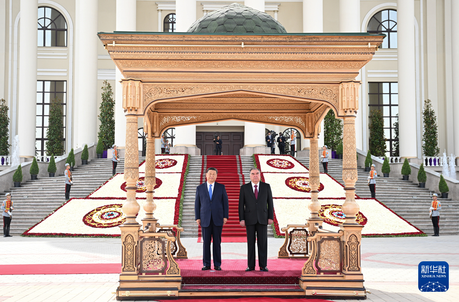 当地时间7月5日下午,国家主席习近平同塔吉克斯坦总统拉赫蒙在杜尚别总统府举行会谈。拉赫蒙为习近平举行盛大隆重的欢迎仪式。新华社记者 谢环驰 摄