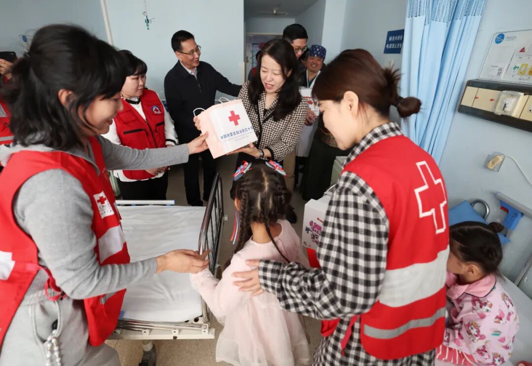 11月11日,蒙古国红十字会副秘书长巴雅尔其木格、中国红十字会总会联络部部长米娜、中国红十字基金会理事长贝晓超前往首都医科大学附属北京安贞医院探望正在接受治疗的14名蒙古国先心病患儿。中国红十字基金会副秘书长周魁庆,内蒙古自治区红十字会党组成员、副会长孟克宝音,首都医科大学附属北京安贞医院小儿心脏中心主任王强等陪同探望。